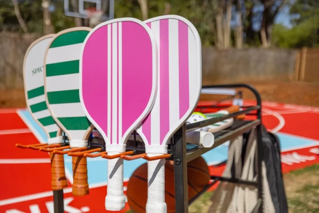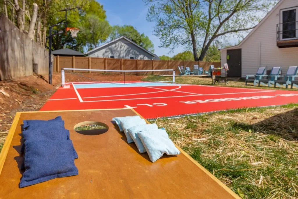 Outdoor? Yeah, There’s a hot tub, tons of games, and the highlight of all highlights—a full-sized pickleball court with its own character, colored concrete, hashtags, and art.