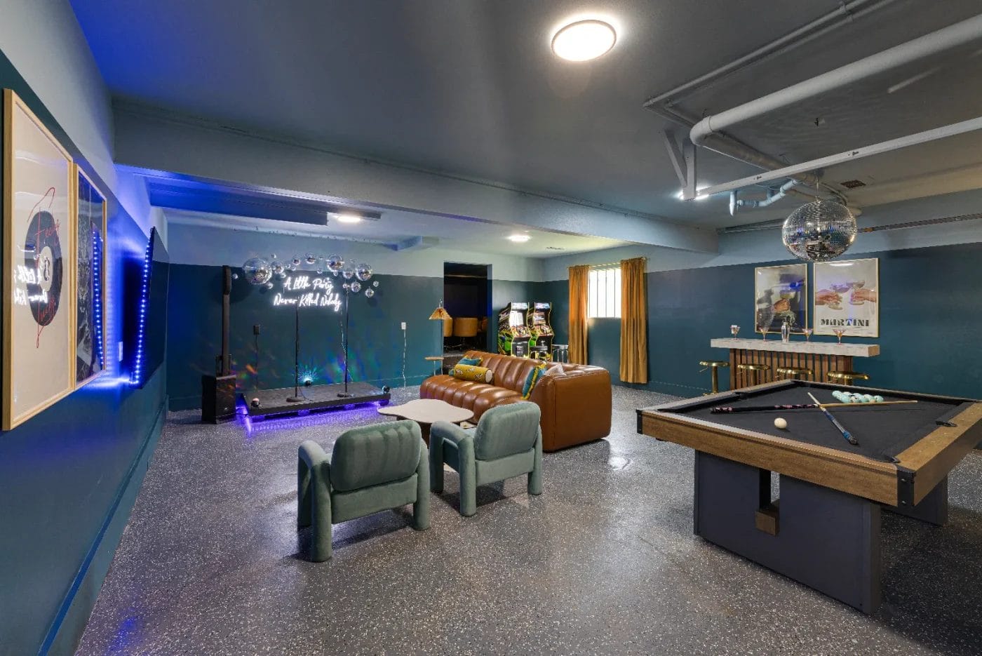 I was told it’s the first Airbnb to have a built-in pickleball court, and it shows! The vibe continues with brewery-style wall art, cornhole boards, a firepit, poker, billiards, board games, and even a karaoke stage with mics, party lights, and music for an epic night in.