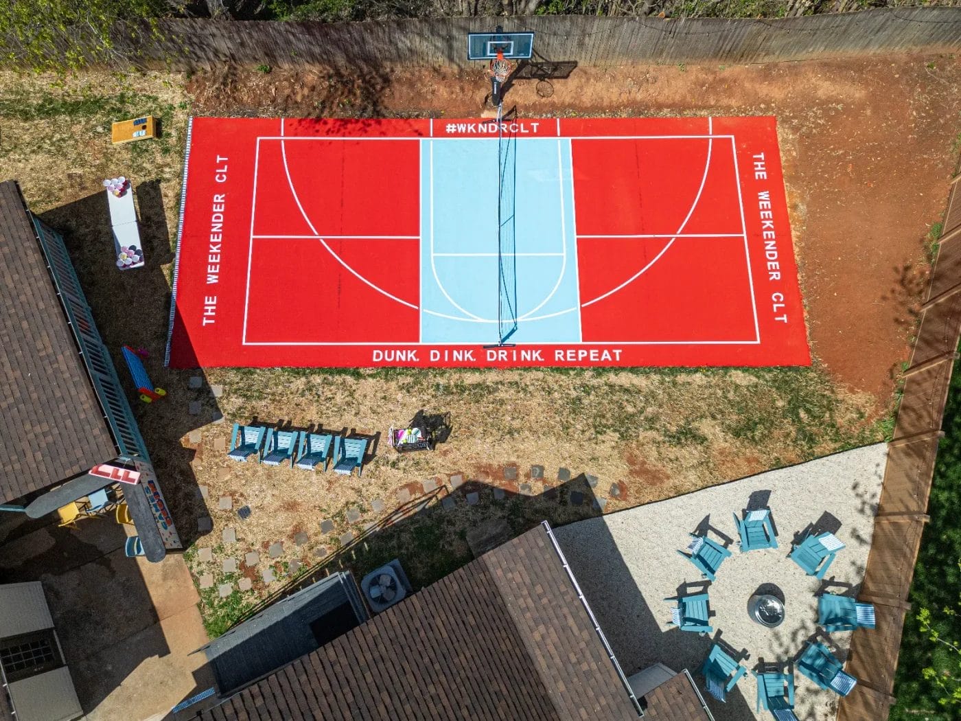 Outdoor? Yeah, There’s a hot tub, tons of games, and the highlight of all highlights—a full-sized pickleball court with its own character, colored concrete, hashtags, and art.