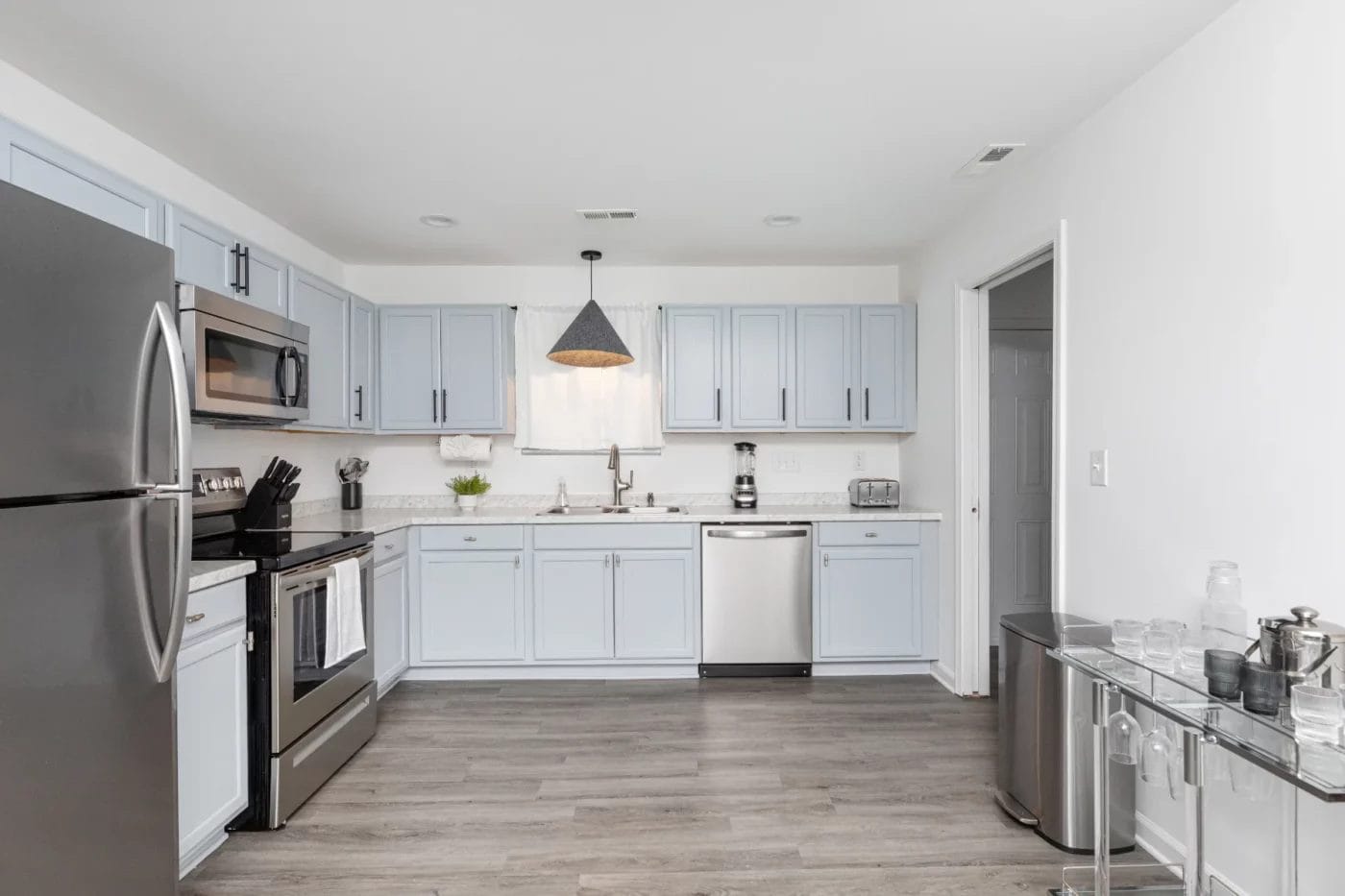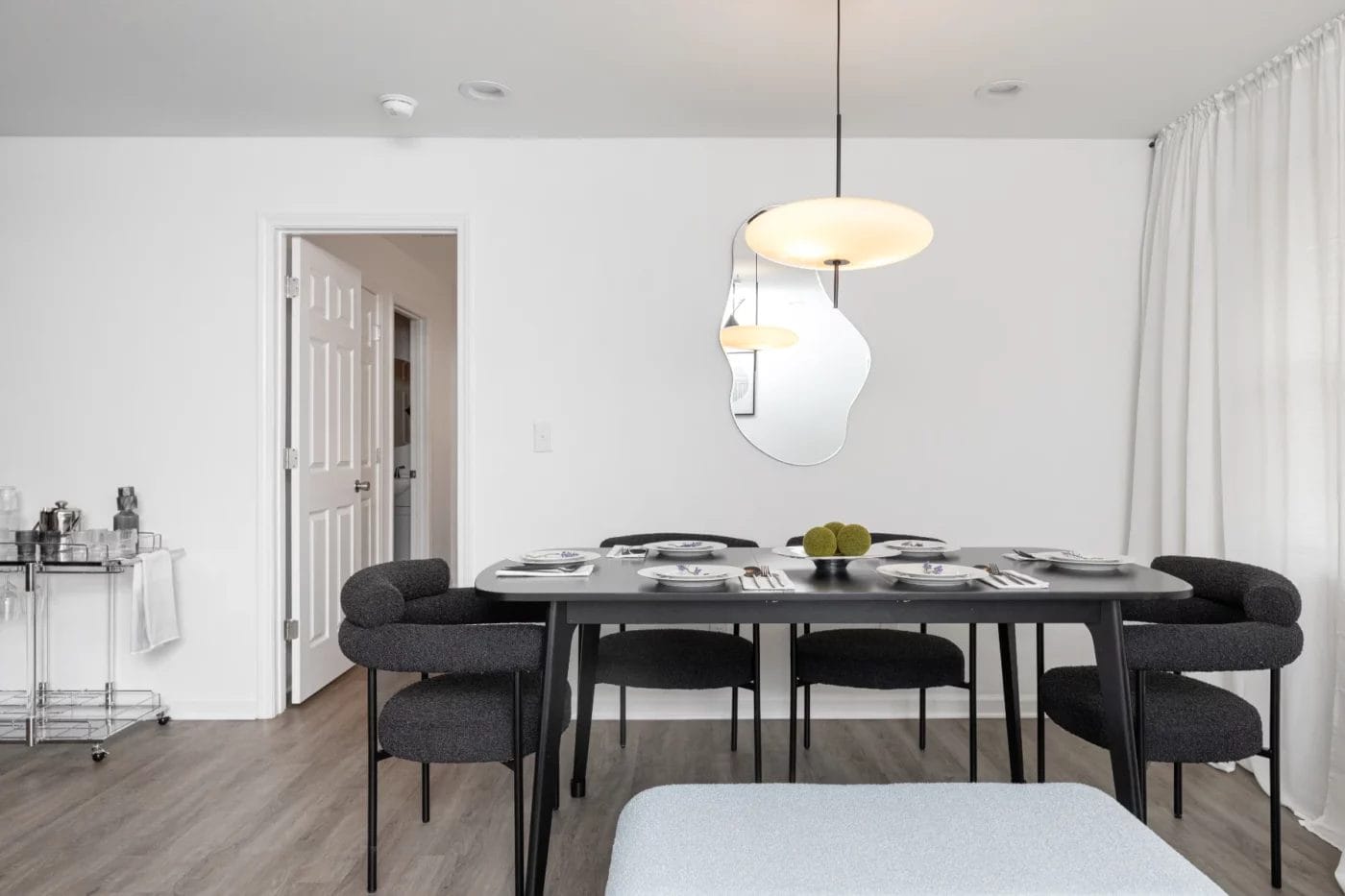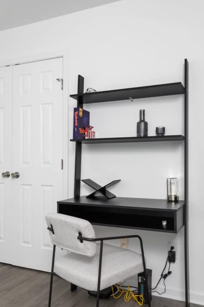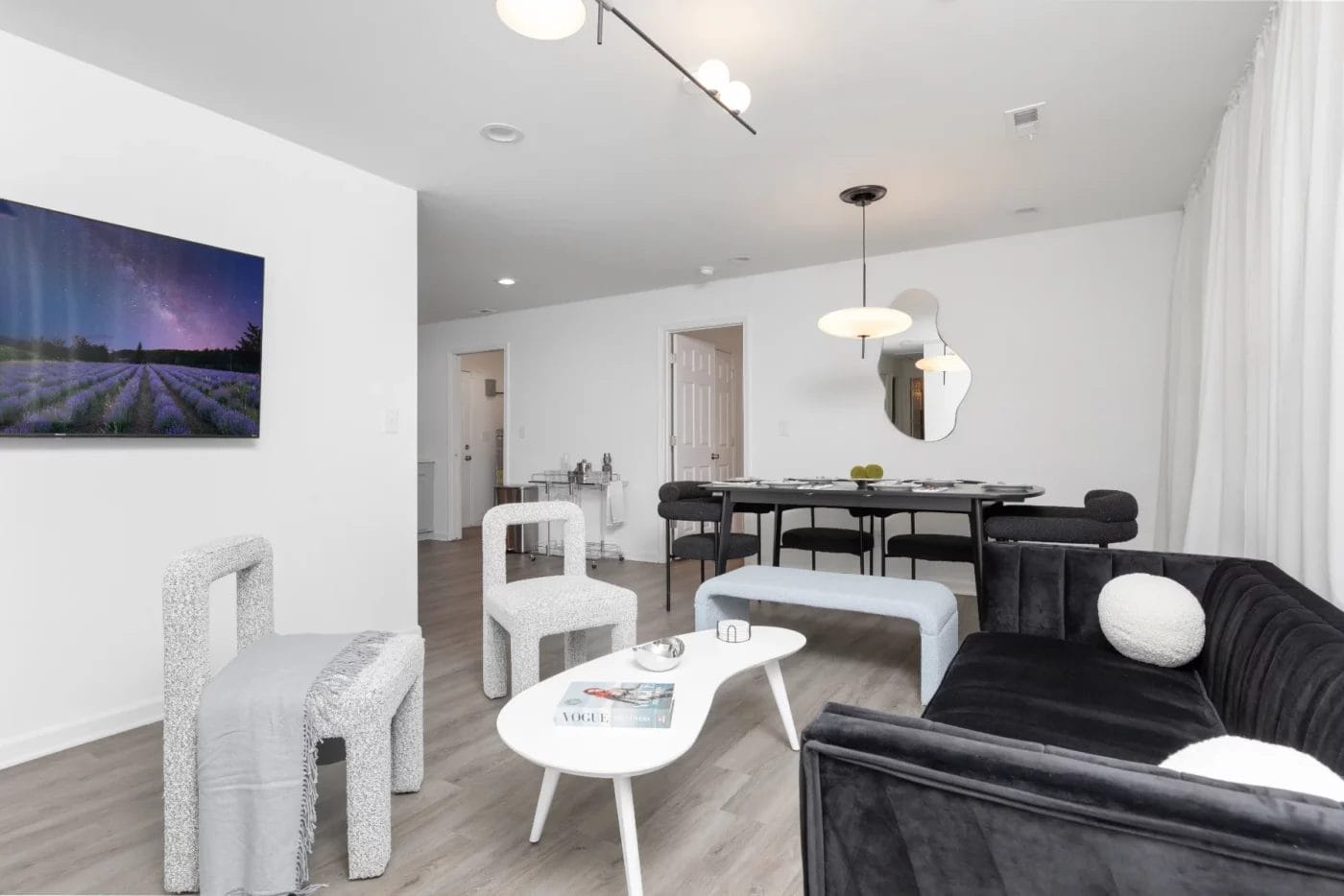 In this Airbnb, the accent walls, light fixtures, neutral wall colors with beautiful furniture, unique bed frames with hanging lights makes it a cool airbnb.