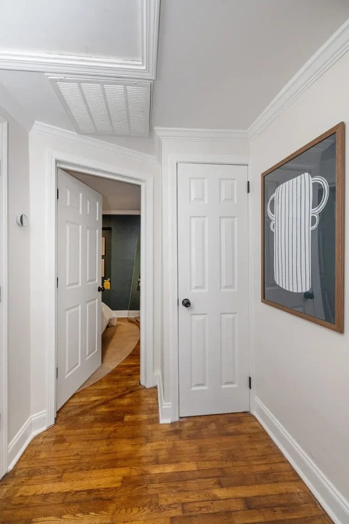 Despite its compact size, the home is full of personality. The ceiling height didn’t stop the interior designer from making bold choices, like a stylish gooseneck lamp in the living room and charming dining chairs that add a playful touch, and bold colors on the wall. Every corner is filled with practical essentials, creating a space that feels both warm and well-prepared for guests.