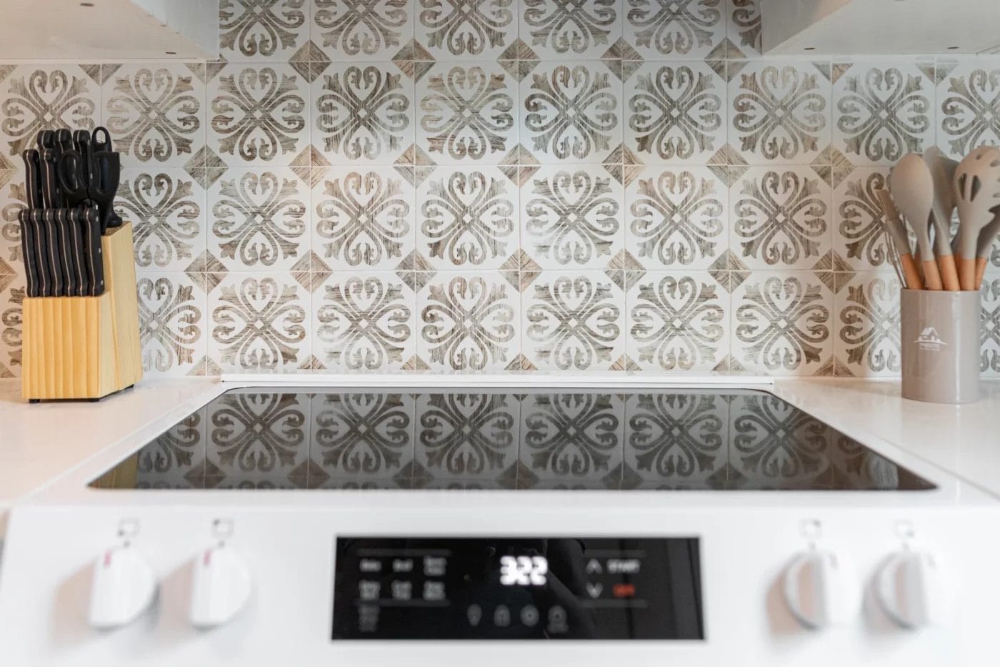 - Kitchen tile work with the appliances, countertop quartz that makes the bar chairs pop. I had to tilt them a bit to show some perspective
