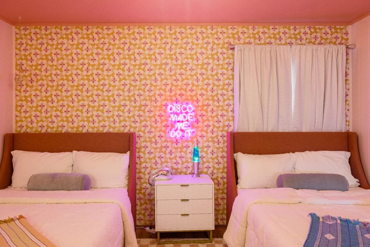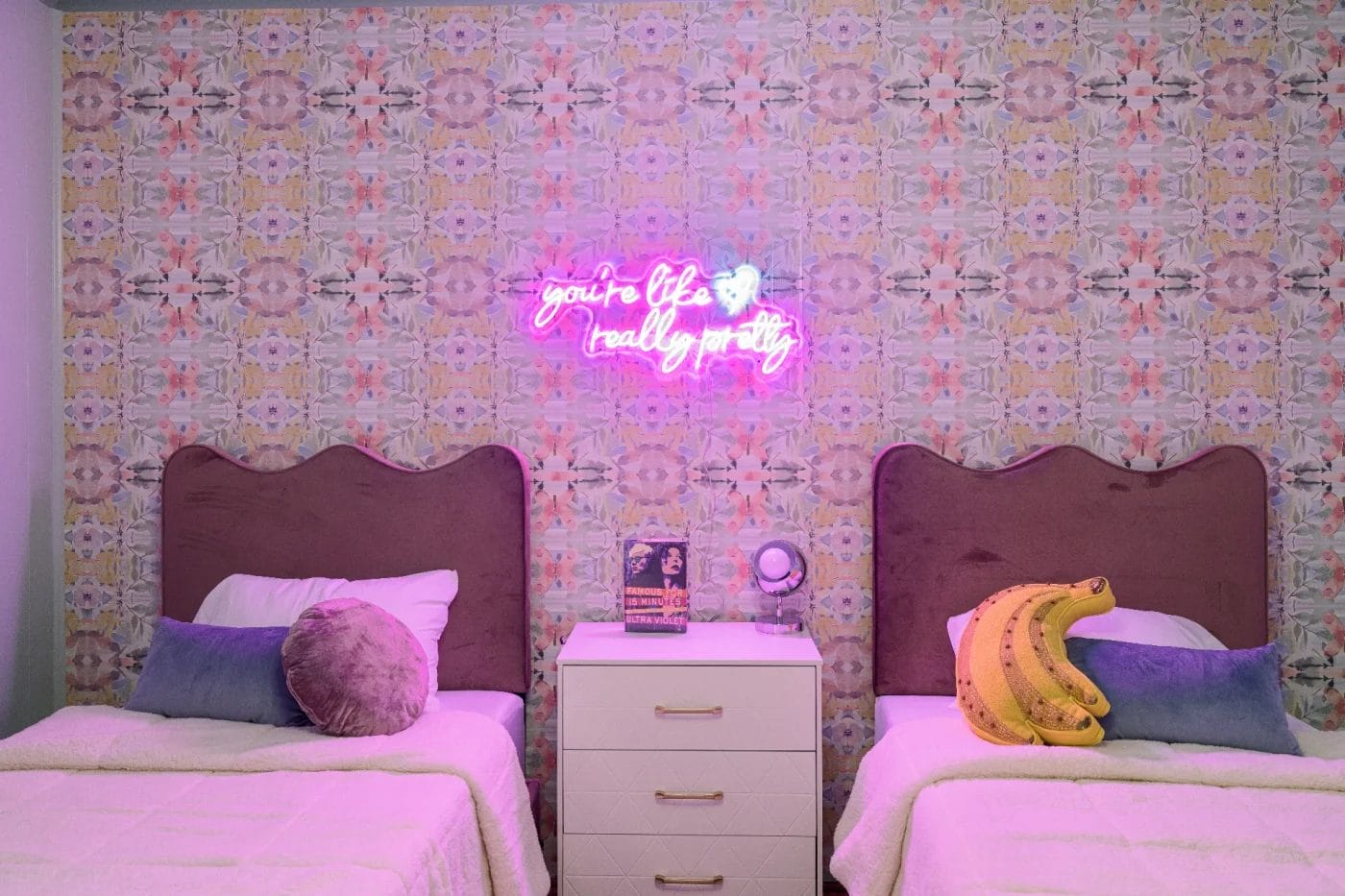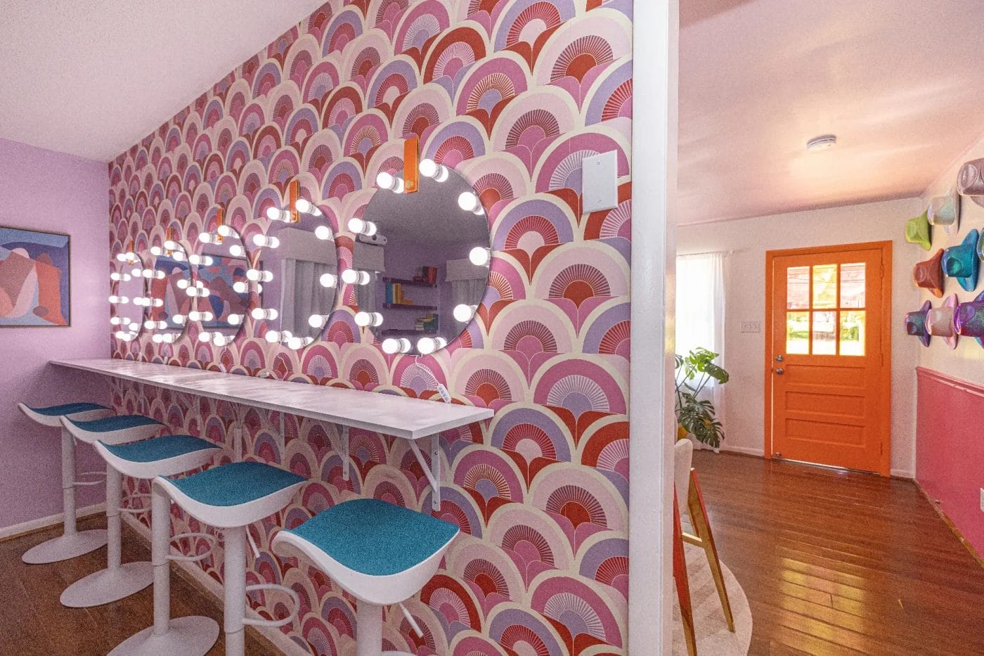 As a professional Airbnb photographer, I’ve captured all kinds of properties with various themes, but this 70’s style Barbie-themed Airbnb was unlike anything I’ve ever done. The space was bursting with vibrant colors, from the paintings and furniture to the Barbie lights, wallpapers, photo frames, and bedding. Every corner of this property was carefully designed to create a fun, nostalgic atmosphere. The large projector would absolutely be a treat to the airbnb guests. It’s sure to give guests a one-of-a-kind, memorable experience!
